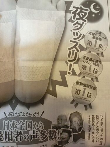 最近、とにかく見かける奇妙な商品がこの 「足の裏にはる謎の健康グッズ」 なんでも、一晩張っておくと、 次の朝にはずっしりべっとり、足の裏から吸収した 悪いものが黒くゲル状に固まっていて、 すっきりするというもの。 キャッチも、「沢山取れたのをみ…