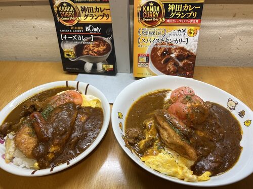 この日のあいがけは神田カレーグランプリシリーズから トッピングはオムレツ、チキンナゲット、ソーセージ、そして生トマト ボンディ チーズカレーサイド Amazonのセールで5箱送料込み¥1500を切ってくれてありがたいなと 食べる前にかけたそばからわかる超…