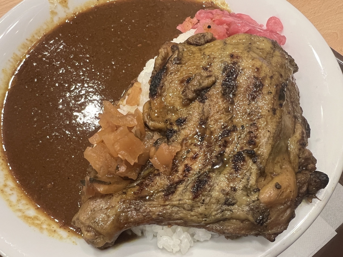どこに入っても頼むのはその時の限定系でこの日はいわゆる骨付きチキンカレーが一押しっぽいので大盛りにて