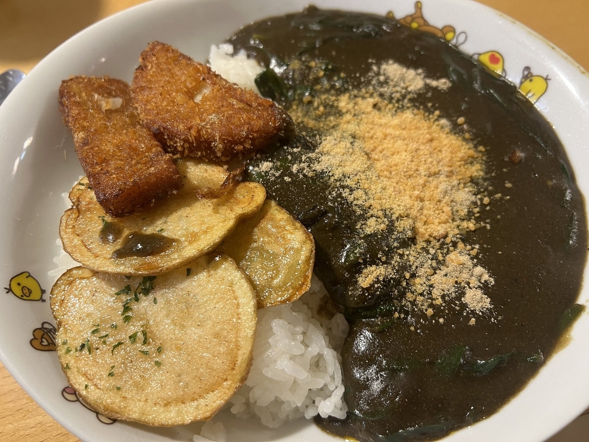 プレゼントでいただいた船場カリーにニラを入れて、フライドポテトとカマボコカツ